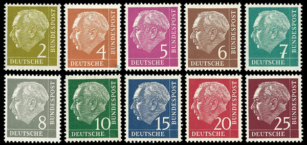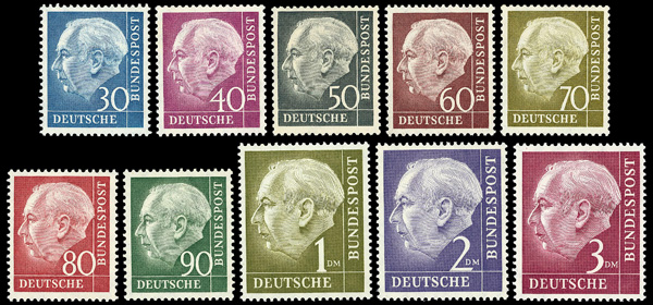 6015 nh 702-721 image1953 Heuss complete (Scott 702-721), set of 20, o.g., never hinged, Very Fine to Extremely Fine.