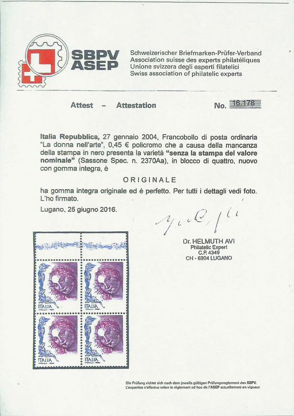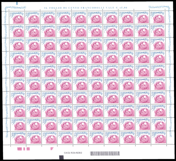 6053 nhbl 2447 var. image2004, 45c Venus of Urbina, denomination omitted (Scott 2447 var.), complete sheet of 100, o.g., never hinged, fresh and bright, previously folded in quarters but with perforations still solid and intact, Very Fine, a fun and attractive collateral item, with photocopy of 2016 Avi (SBPV/ASEP) certificate for similar block of four.