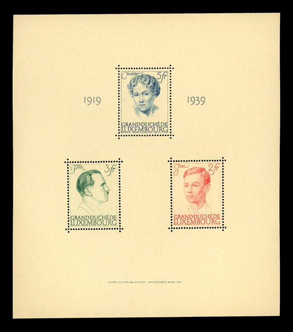 6070 nh 217 image1939, Reign Anniversary of Grand Duchess Charlotte, souvenir sheet of 3 (Scott 217), o.g., never hinged, Extremely Fine.