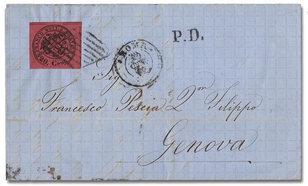 6041 cover 16 image1867, 20c black on copper red (Scott 16), tied on a folded letter from Rome to Genoa, Aug 29, 1868, Fine to Very Fine.