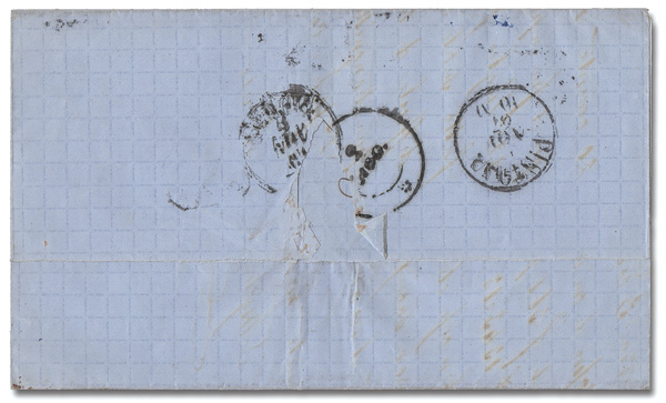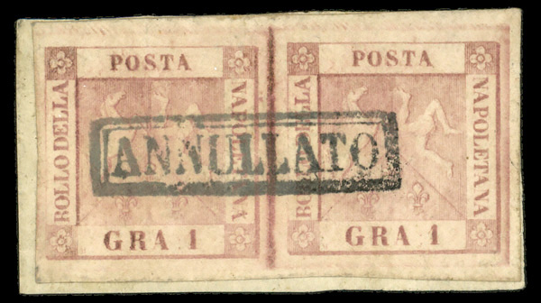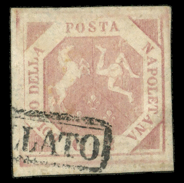 6047 cover 2, 4, 6 image1858, Arms, 1g pale lake, 5g brown lake & 20g rose lake (Scott 2, 4, 6), tied by boxed ANNULLATO handstamp on a folded cover from Naples, via France to London, England, in Nov 1858; all appropriate markings; somewhat stained/soiled, otherwise Fine to Very Fine. Scott prices just the 20g on cover at $2.900., with a 2024 P.F. certificate.