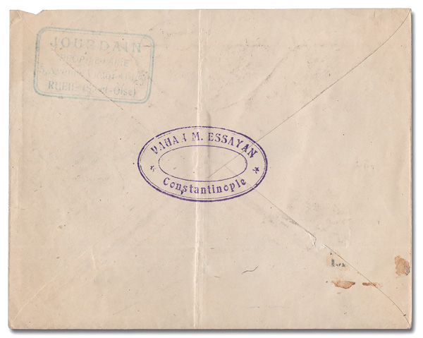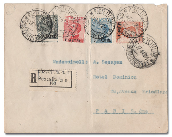 6055 cover 22-25 image1921, 2pi on 15c to 10pi on 60c (Scott 22-25), tied by Constantinople c.d.s.s, Nov 17, 1921, on a Registered cover to Paris; central file fold between stamps, Fine to Very Fine and scarce. (Image) (Image2) (All Images)