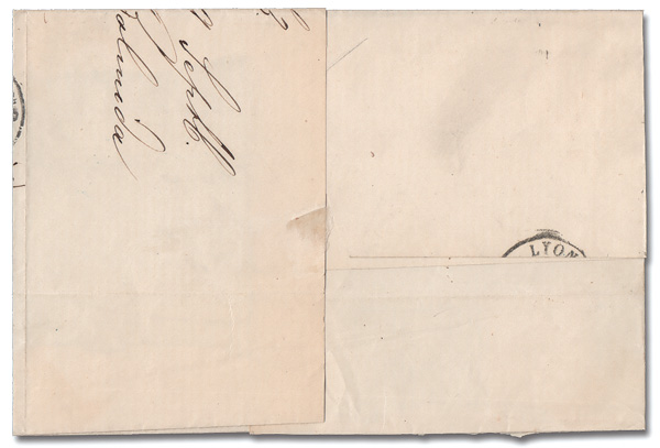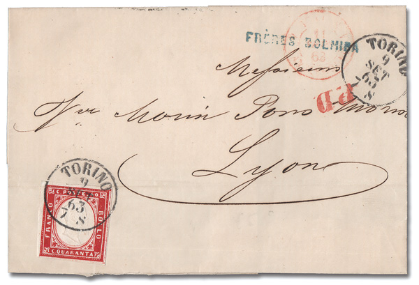 6044 cover 13b image1855-63 Victor Emmanuel II 40c carmine (Scott 13b), fresh, four-margin example neatly tied by one of two strikes Torino c.d.s.s, Sep 9, 1863, on a large part of a folded cover to Lyon, France; red "P.D" handstamp and faint Sep 11 French entry c.d.s. and showing a small part of a Lyon receiver on the reverse, Very Fine.
