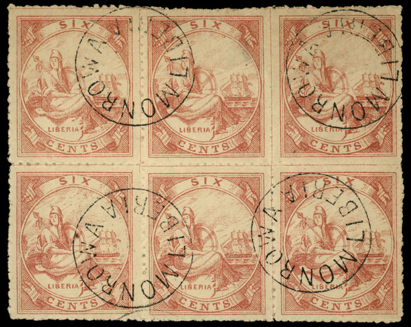 6068 Obl 7 image1864, 6c red 'Liberia' (Scott 7), block of 6, Very Fine to Extremely Fine.