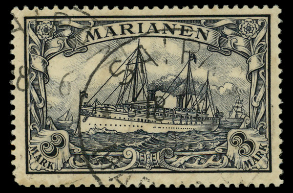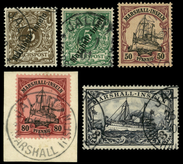 6078 O 7, 8, 20, 21 & 24 image1899-1901, 3pf & 5pf Numerals overprint and 50pf, 80pf & 3m Kaiser's Yacht (Scott 7, 8, 20, 21 & 24), Fine to Very Fine.