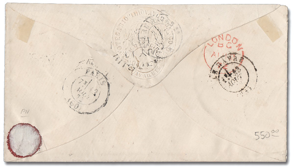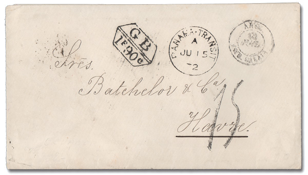6090 cover   image1872 Stampless Cover to Havre, France, clear Jun 15 British "PANAMA-TRANSIT" c.d.s., "GB/1f 90c" accountancy mark, Aug 12 Calais French entry c.d.s., and handstamped "15" (decimes due) on the front; London, Paris and Le Havre c.d.s.s on the reverse; embossed seal of the Guayaquil (Ecuador) National Band on the flap but no Ecuadorian markings, Very Fine. (Image) (Image2) (All Images)