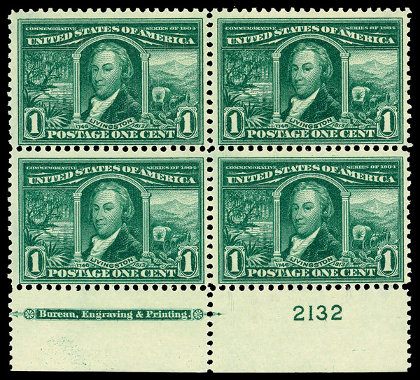 5111 nhbl 323 image1904, 1¢ Louisiana Purchase (Scott 323), bottom margin plate number 2132 block of 4 with imprint, o.g., never hinged, with deep color and proof-like detail, all on fresh paper, Fine to Very Fine.
