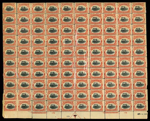 5097 nh/ogbl 295 image1901, 2¢ Pan-American (Scott 295), bottom left full pane of 100 with plate number 1176 - 1174 and imprint, a rare survivor with cool colors in near-perfect registry; faults including separations, Fine, Scott value as hinged plates & singles.
