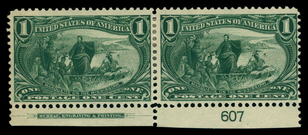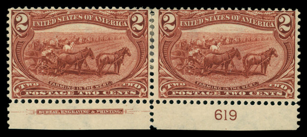 5086 og 285 image1898, 1¢ Trans-Miss. (Scott 285), imprint and plate number pair, o.g., hinge remnants, Fine to Very Fine.