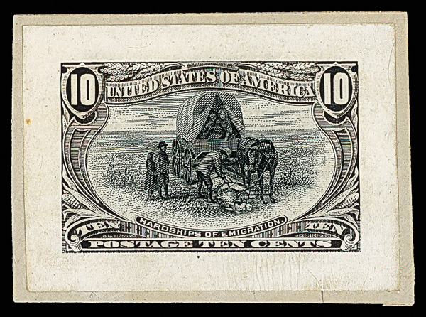 5092 P 290P2 image1898, 10¢ Trans-Miss., "Roosevelt" small die proof (Scott 290P2), fresh with deep color, album page margins cull and balanced, Very Fine.