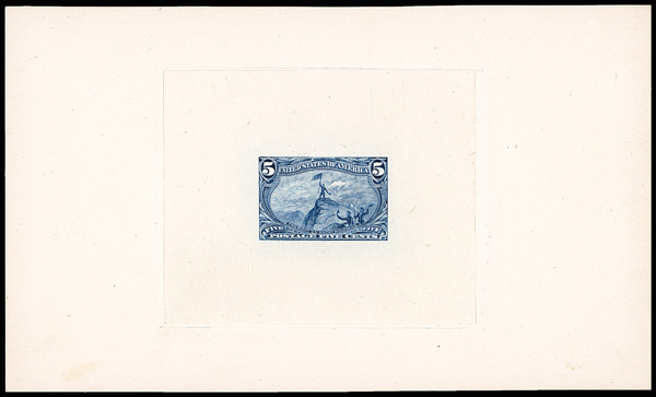 5090 P 288P1 image1898, 5¢ Trans-Miss., large die proof (Scott 288P1), with bold, solid color on 82 x 67mm India die-sunk on 169 x 101mm card; as pretty as they come, Extremely Fine and choice.