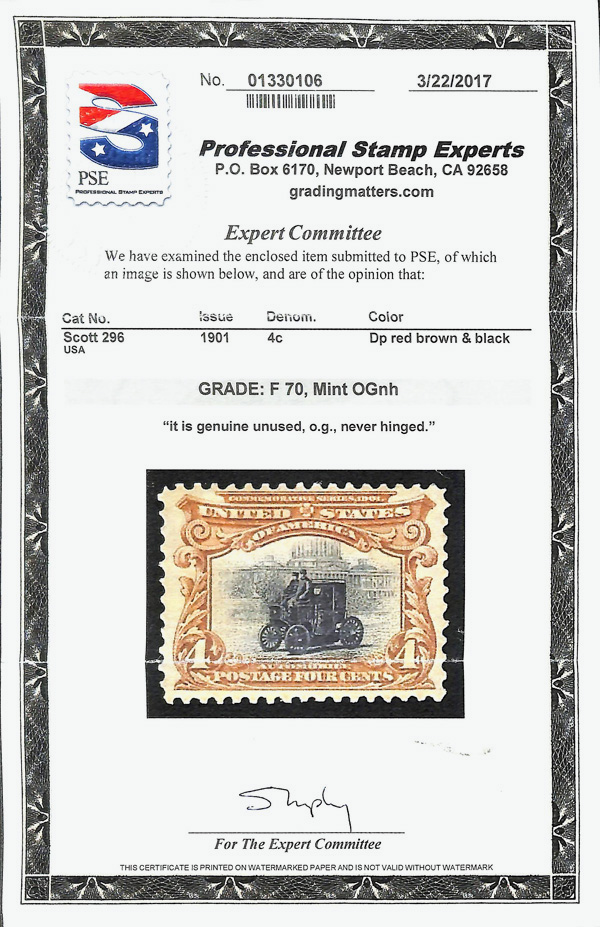 5098 nh 296 image1901, 4¢ Pan-American (Scott 296), single, Another nice example., o.g., never hinged, Fine, with 2017 P.S.E. certificate graded F 70.