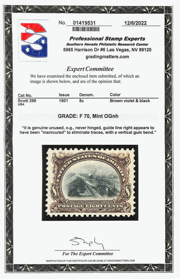 5101 og 298 image1901, 8¢ Pan-American (Scott 298), Very nice example of this value., Fine, with 2022 P.S.E. certificate graded F 70.