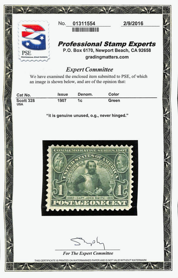 5115 og 328 image1907, 1¢ Jamestown (Scott 328), slightly disturbed o.g., Extremely Fine.