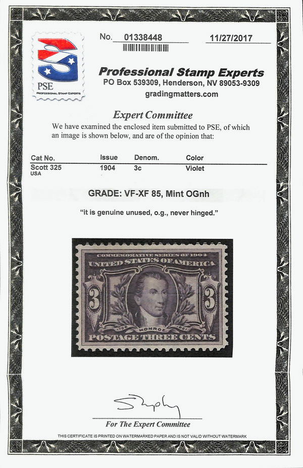 5113 nh 325 image1904, 3¢ Louisiana Purchase (Scott 325), Lovely clarity and freshness, o.g., never hinged, Very Fine to Extremely Fine, with 2017 P.S.E. certificate graded VF-XF 85.