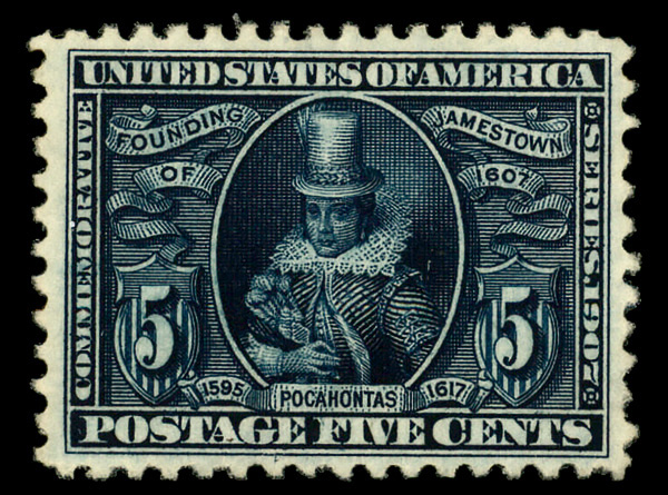 5118 og 330 image1907, 5¢ Jamestown (Scott 330), o.g., hinge remnant; small thin, Very Fine.