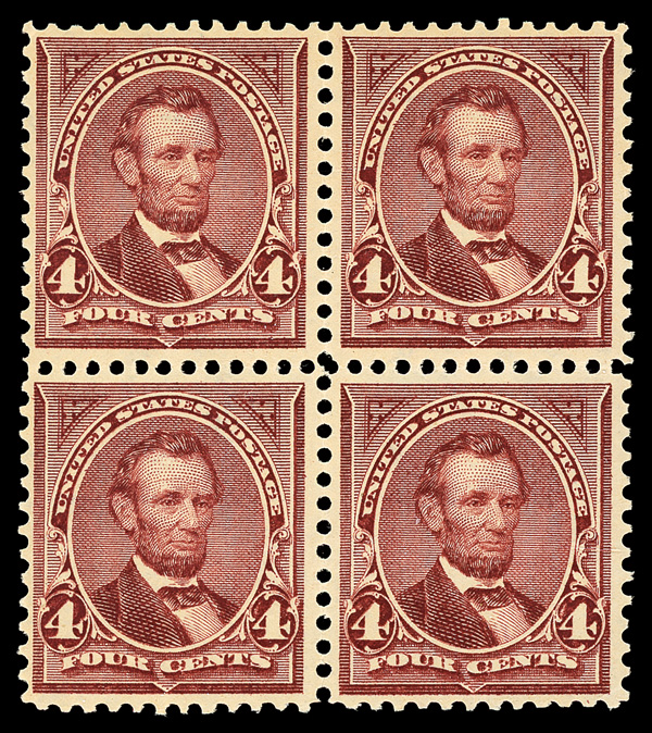 5083 nhbl 280 image1898, 4¢ rose brown (Scott 280), block of 4, o.g., never hinged, a pristine, sound block with exuberant color and solid to superior, Very Fine.
