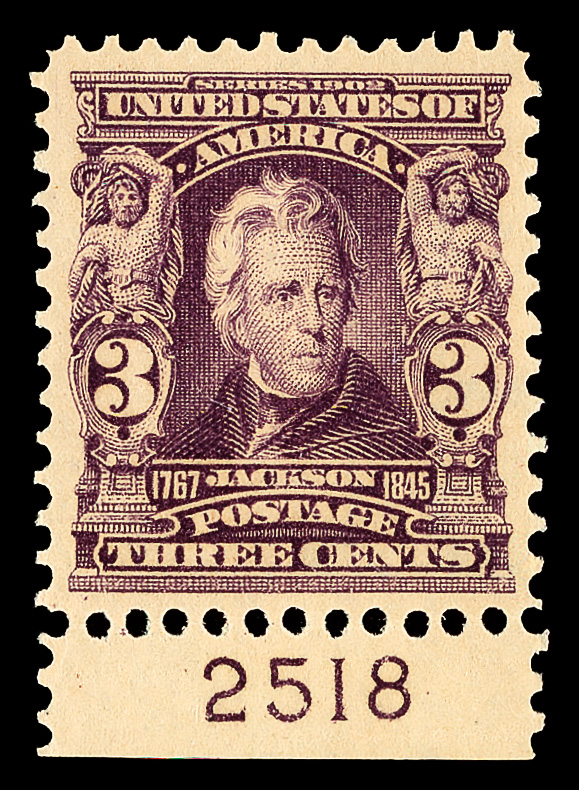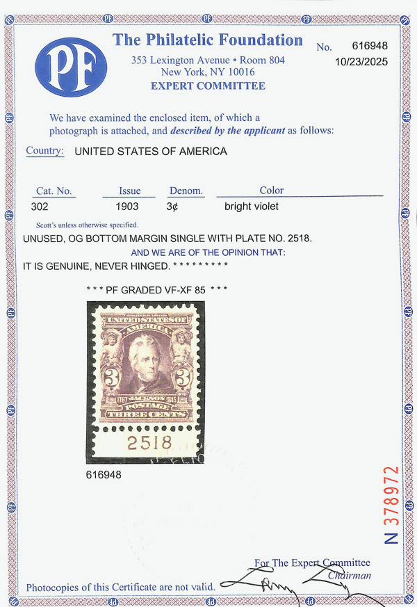 5102 nh 302 image1903, 3¢ bright violet (Scott 302), bottom margin plate number 2518 single, o.g., never hinged, sound and Post Office fresh with superior centering and crisp, deep color, Very Fine to Extremely Fine, with 2025 P.F. certificate graded VF-XF 85.