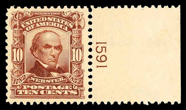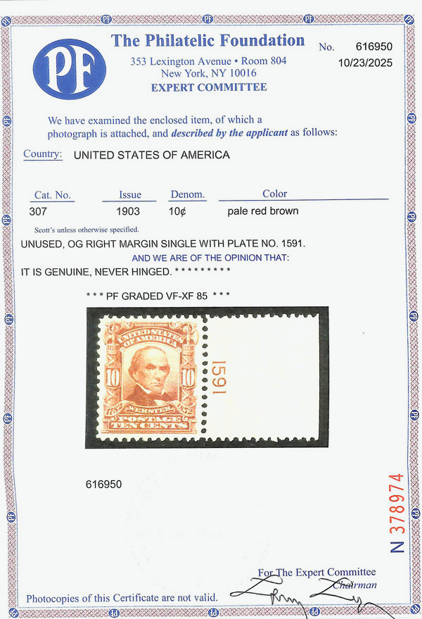 5104 nh 307 image1903, 10¢ pale red brown (Scott 307), right margin plate number 1591 single, o.g., never hinged, pretty positional with compelling color, clarity and centering, Very Fine to Extremely Fine, with 2025 P.F. certificate graded VF-XF 85.