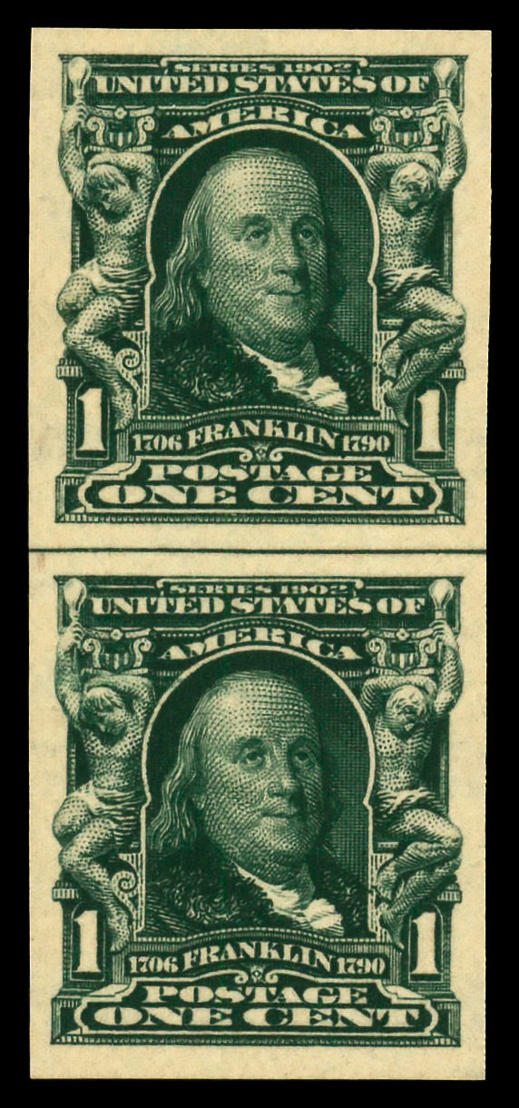 5107 nh 314 image1906, 1¢ blue green, imperf. (Scott 314), vertical pair with horizintal guide line, o.g., never hinged, Extremely Fine.
