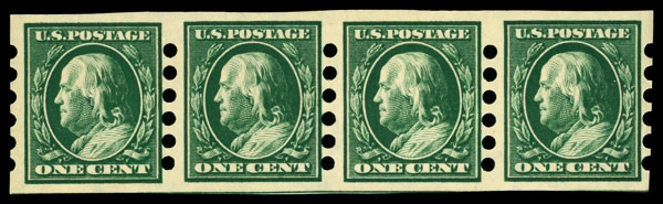 5120 og 343 image1908, 1¢ green, D.L. watermark, imperf., Mailometer type I separations (Scott 343), strip of 4, o.g., hinged, Very Fine.