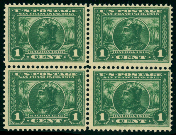 5145 nhbl 397 image1913, 1¢ Panama-Pacific, perf. 12 (Scott 397), block of 4, o.g., never hinged, Fine to Very Fine.