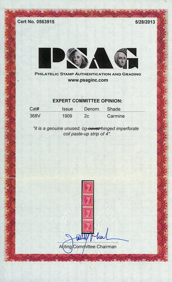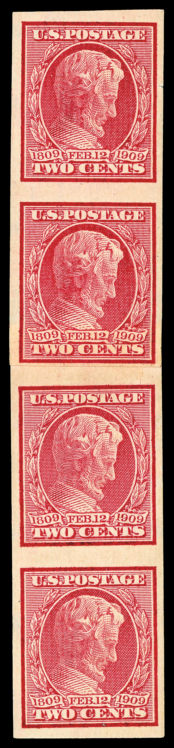 5131 og 368V image1909, 2¢ Lincoln Centenary, imperf., vertical coil (Scott 368V), strip of 4 with paste-up in the center, o.g., hinged, sound with intense color and deep lines, Very Fine.