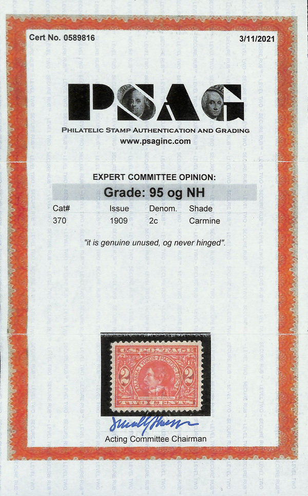 5132 nh 370 image1909, 2¢ Alaska-Yukon (Scott 370), o.g., never hinged, Extremely Fine to Superb, with 2021 P.S.A.G. certificate graded XF-SUP 95.