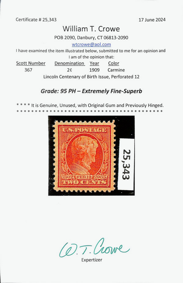 5128 og 367 image1909, 2¢ Lincoln (Scott 367), single, o.g., lightly hinged twice, Extremely Fine to Superb, with 2024 Crowe certificate graded XF-SUP 95.