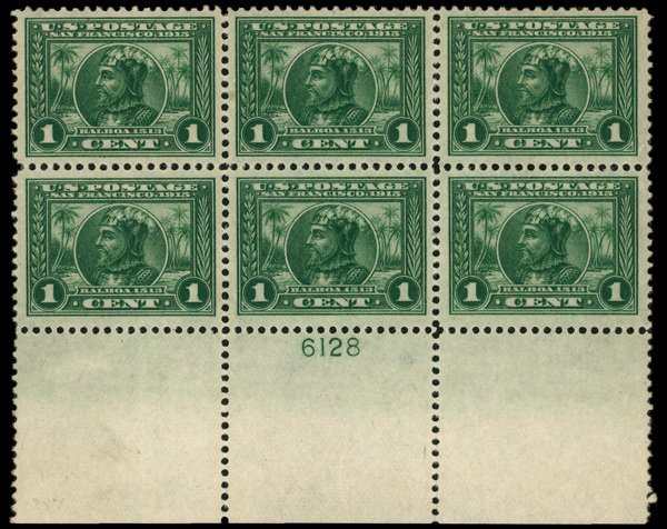 5144 ogbl 397 image1913, 1¢ Panama-Pacific, perf. 12 (Scott 397), bottom margin plate block of 6, Bold, vibrant color throughout, o.g., previously hinged; small corner crease on upper right stamp, Very Fine.