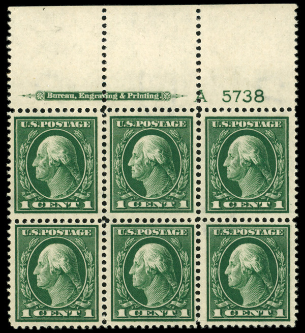 5149 nhbl 405 image1912, 1¢ green, S.L. watermark, perf. 12 (Scott 405), top margin plate block of 6, Crisp, sharp printing detail, o.g., never hinged; tiny perf disc indent on lower right stamp, Very Fine.