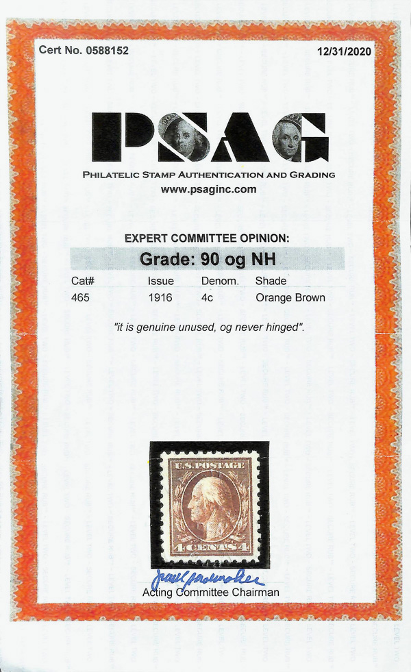 5159 nh 465 image1916, 4¢ orange brown, unwatermarked, perf. 10 (Scott 465), Bright natural color glow, o.g., never hinged, Extremely Fine, with 2020 P.S.A.G. certificate graded XF 90.