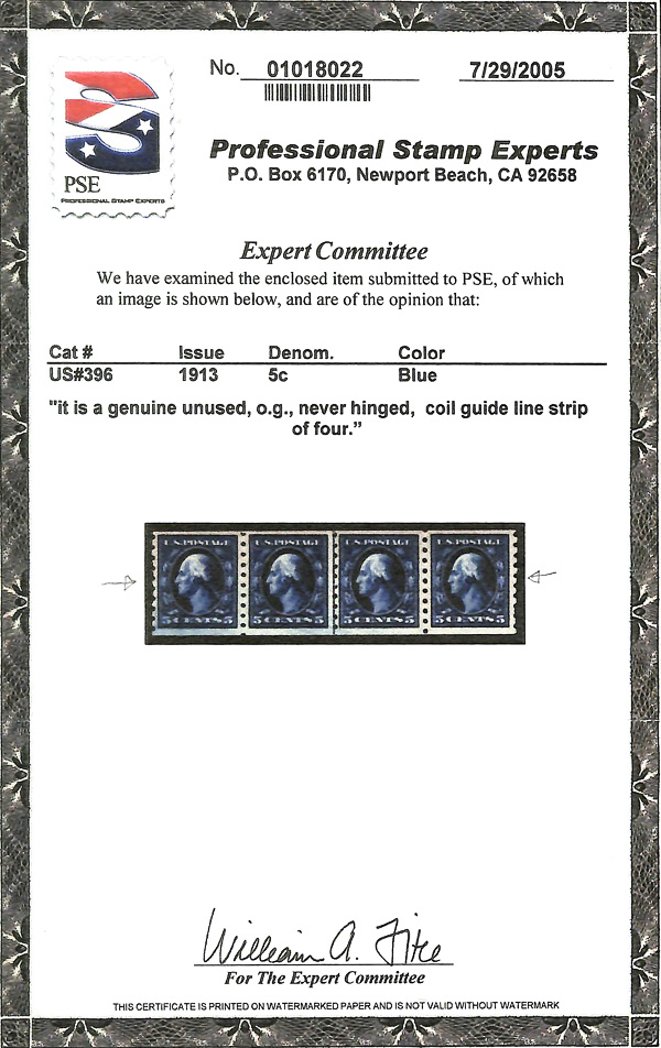 5143 nh 396 image1913, 5¢ blue, S.L. watermark, horizontal coil, perf. 8½ vertically (Scott 396), o.g., never hinged, Fine to Very Fine, with photocopy of 2005 P.S.E. certificate for strip.