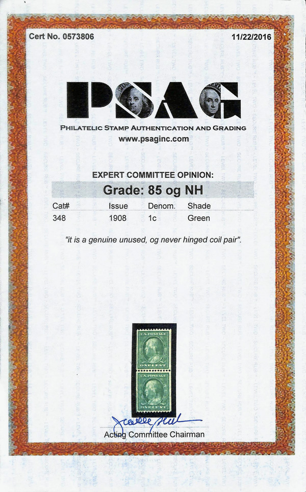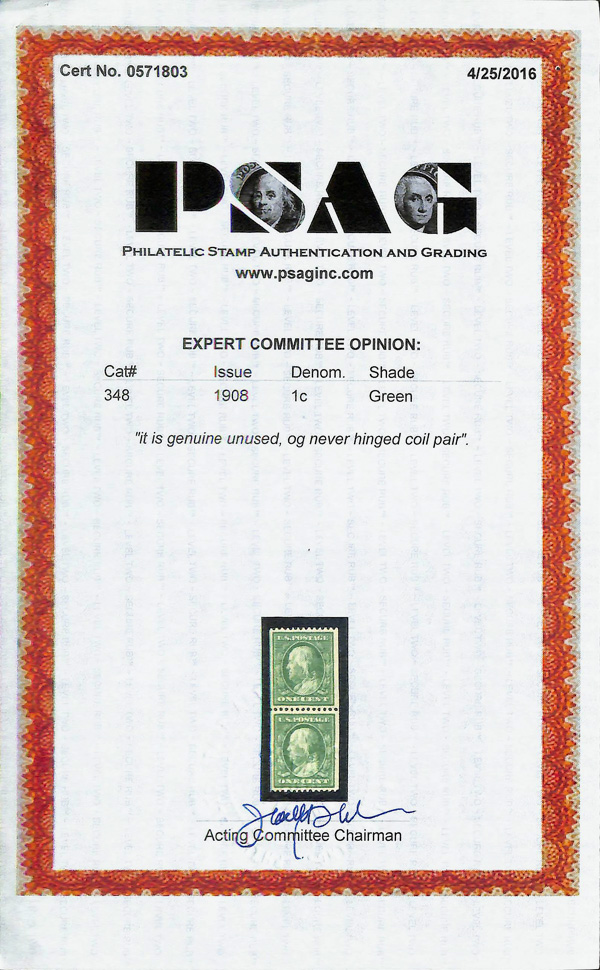5127 nh 348 image1908, 1¢ green, D.L. watermark, vertical coil, perf. 12 horizontally (Scott 348), pair, o.g., never hinged, fresh and sound with rich color and superior centering, vertical guide captured at left, Very Fine to Extremely Fine, with two 2016 P.S.A.G. certificates, one graded VF-XF 85.