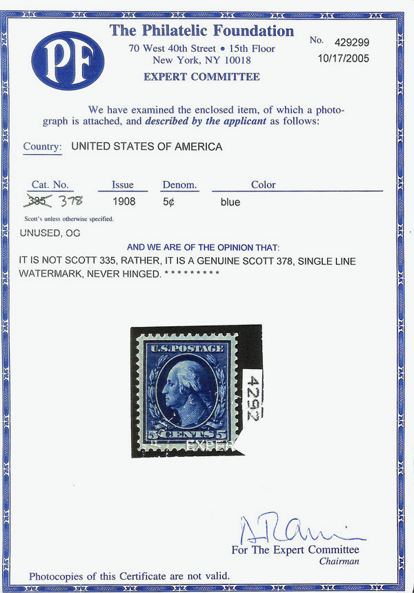 5140 nh 378 image1911, 5¢ blue, S.L. watermark (Scott 378), o.g., never hinged, Post Office fresh with incredible color depth and clean detail, sound with superior centering, Extremely Fine, with 2005 P.F. certificate.