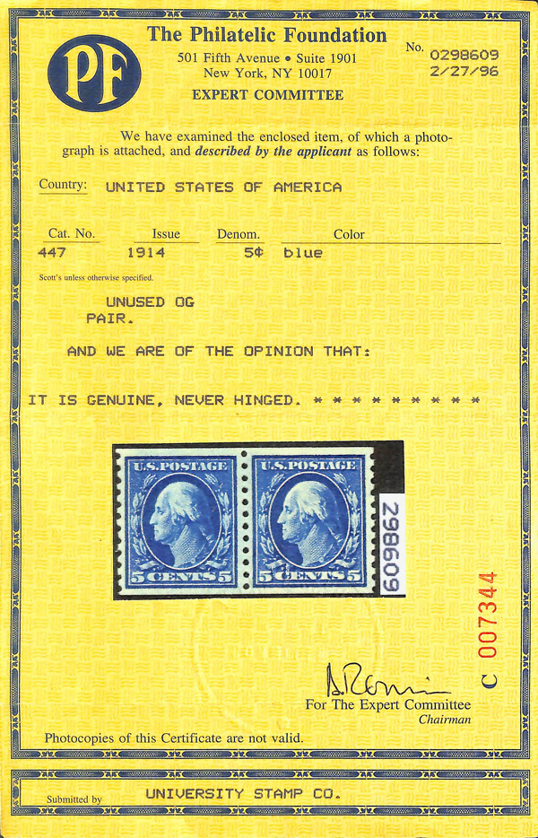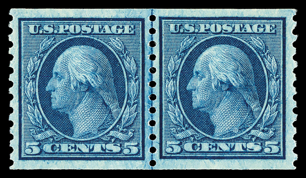 5156 nh 447 image1914, 5¢ blue, S.L. watermark, flat plate coil, perf. 10 vertically (Scott 447), pair, o.g., never hinged, a choice example with rich color and superior centering, Very Fine to Extremely Fine+, with 1996 P.F. certificate.