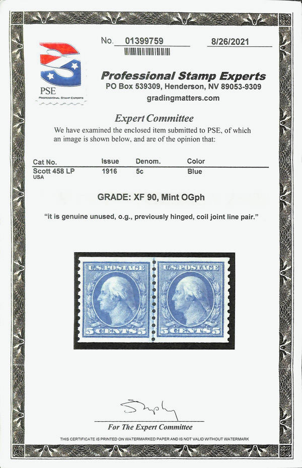5157 og 458 image1916, 5¢ blue, S.L. watermark, rotary press coil, perf. 10 vertically (Scott 458), joint line pair, o.g., barest trace of hinge (appears never hinged), a lovely item with intense color and clean lines, all amid well-balanced margins with gum that truly shows no hint of hingeing, Extremely Fine, with 2021 P.S.E. certificate graded XF 90.