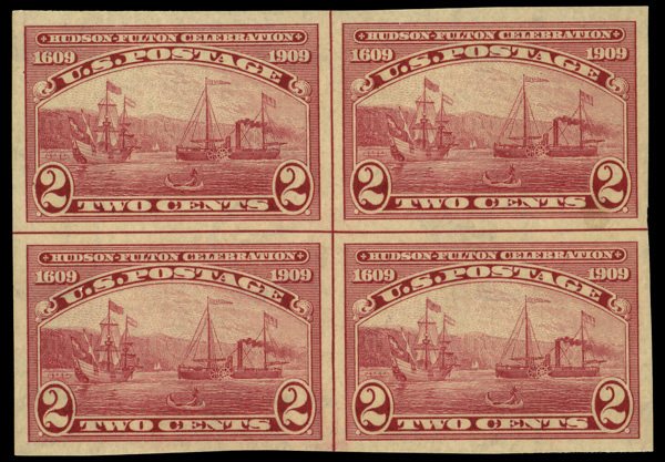 5138 nh/ogbl 373 image1909, 2¢ Hudson-Fulton, imperf. (Scott 373), centerline block of 4, o.g., lightly hinged (3 stamps never hinged), Very Fine to Extremely Fine.