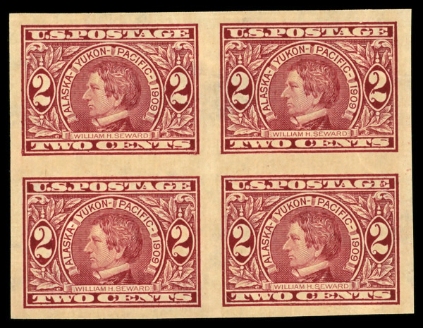 5135 nhbl 371 image1909, 2¢ Alaska-Yukon, imperf. (Scott 371), block of 4, o.g., never hinged, Extremely Fine to Superb.