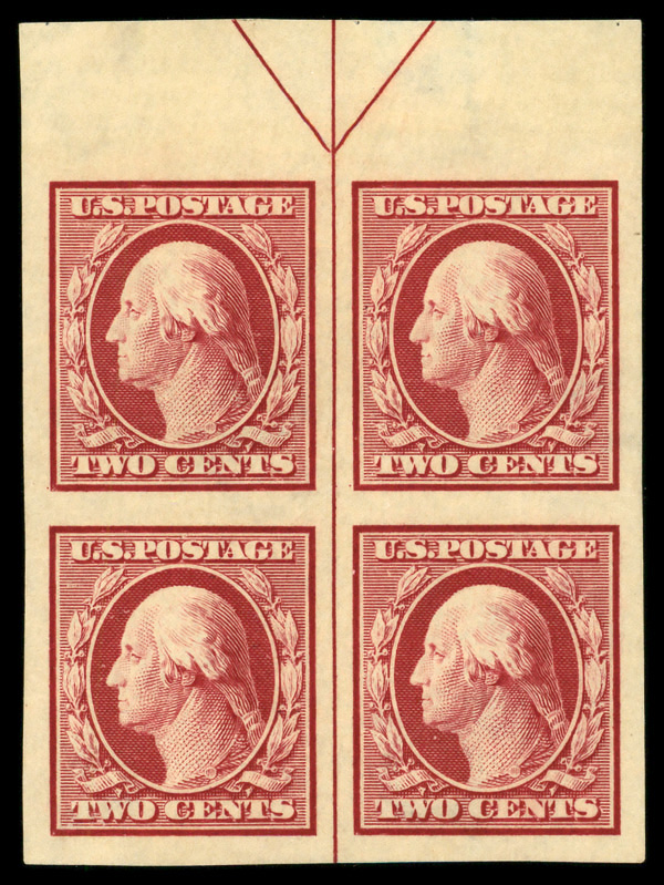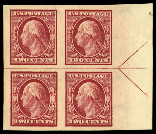 5142 nhbl 384 image1911, 2¢ carmine, S.L. watermark, imperf. (Scott 384), arrow block of 4, o.g., never hinged, Extremely Fine.