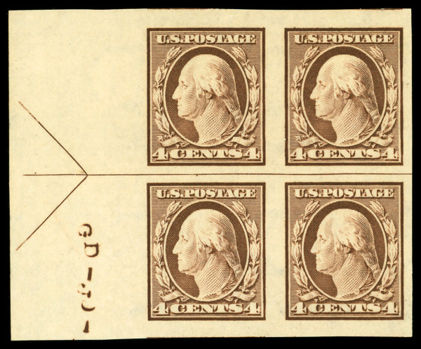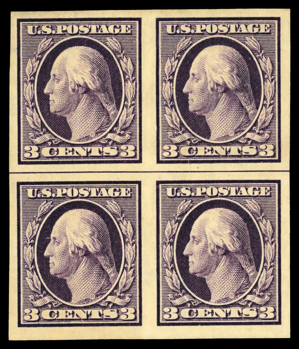 5124 nhbl 345 image1909, 3¢ deep violet, type I, D.L. watermark, imperf. (Scott 345), block of 4 with horizontal guide line (2mm spacing), o.g., never hinged, Very Fine.