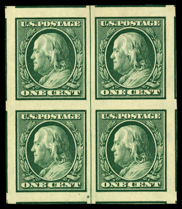5121 nhbl 343 image1908, 1¢ green, D.L. watermark, imperf. (Scott 343), block of 4 with vertical guide line, o.g., never hinged, Superb.