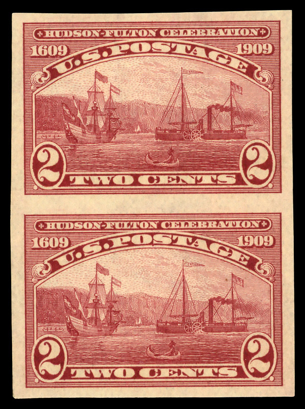 5137 nh 373 image1909, 2¢ Hudson-Fulton, imperf. (Scott 373), vertical pair, o.g., never hinged, Very Fine to Extremely Fine.