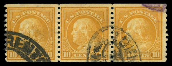 5170 O 497 image1922, 10¢ orange yellow, unwatermarked, rotary press coil, perf. 10 vertically (Scott 497), strip of 3, Fine.