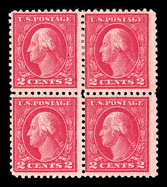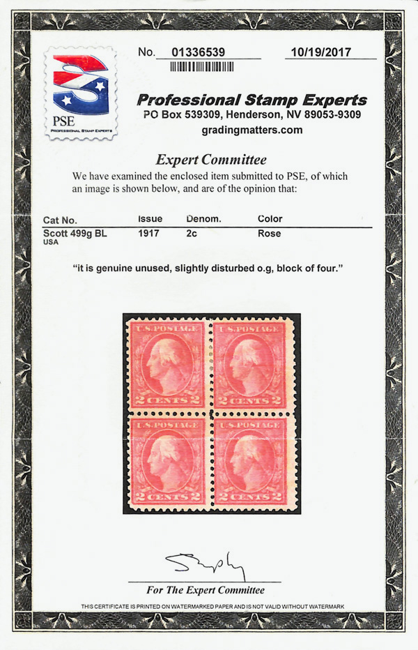 5173 ogbl 499g image1917, 2¢ rose, type I, perf. 11, double impression (Scott 499g), block of 4, slightly disturbed o.g., fresh-faced with obvious doubling of the full design, a sound and appealing multiple, Fine to Very Fine, with 2017 P.S.E. certificate.