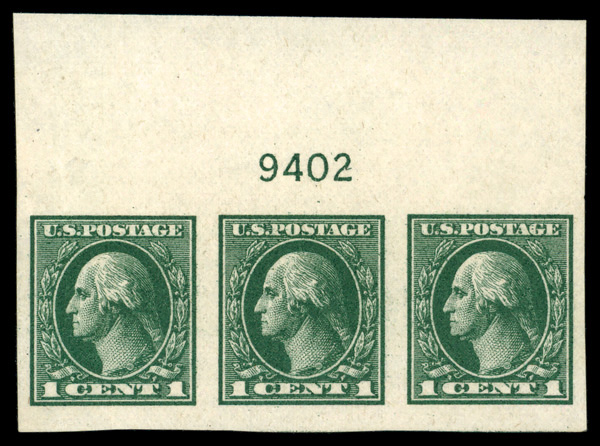 5195 nh 531 image1919, 1¢ green, offset printing, imperf. (Scott 531), strip of 3 with plate number, o.g., never hinged (minor gum crease), Very Fine to Extremely Fine.