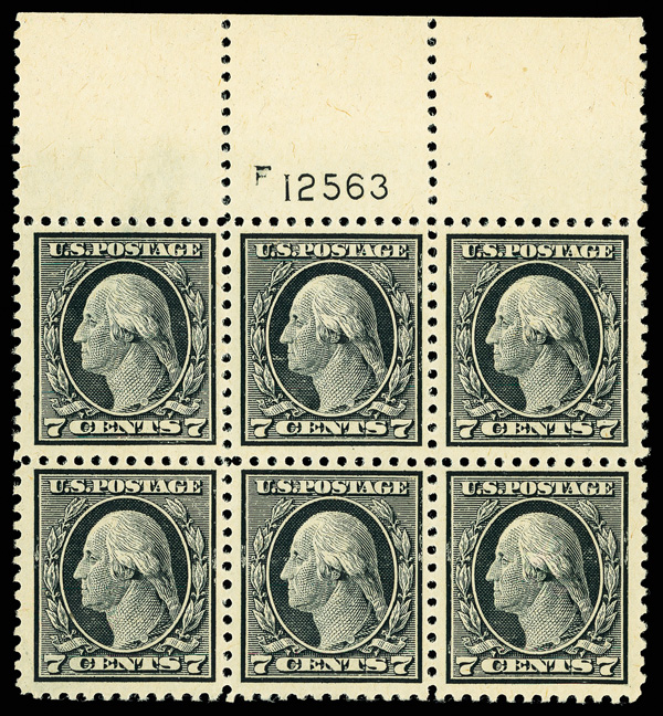 5177 nhbl 507 image1917, 7¢ black, perf. 11 (Scott 507), top margin plate block of 6, Well-centered layout, o.g., never hinged, Very Fine.