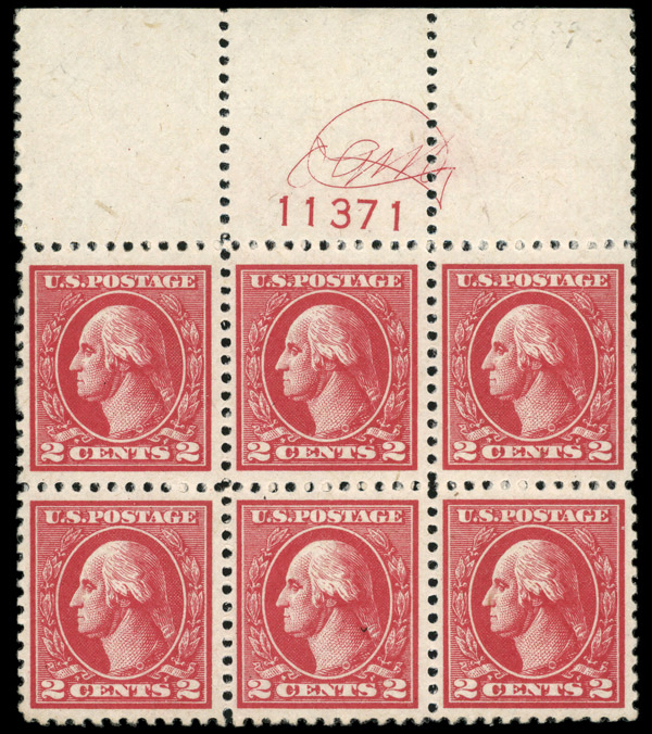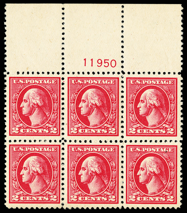 5191 nhbl 528 image1918, 2¢ carmine, type Va, offset printing (Scott 528), top margin plate block of 6, Pleasing margin balance, several very nicely centered stamps, o.g., never hinged; tiny inclusion on top center stamp, Very Fine.