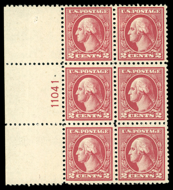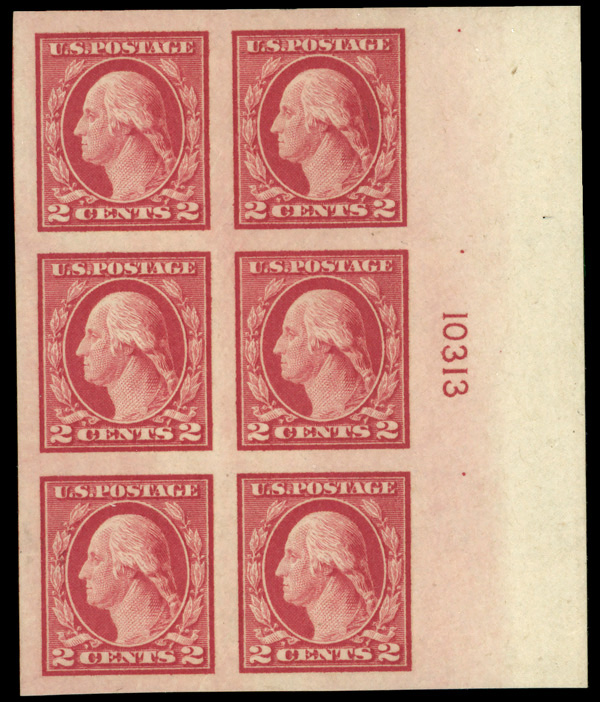 5165 ogbl 482 image1916, 2¢ carmine, type I, unwatermarked, imperf. (Scott 482), plate block of 6, o.g., small hinge remnant, Extremely Fine to Superb.