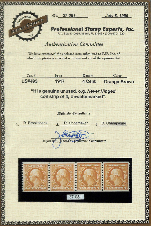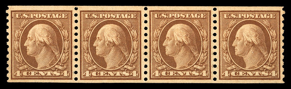 5168 nh 495 image1917, 4¢ orange brown, unwatermarked, rotary press coil, perf. 10 vertically (Scott 495), strip of 4, o.g., never hinged, Very Fine to Extremely Fine, with 1999 P.S.E. certificate.